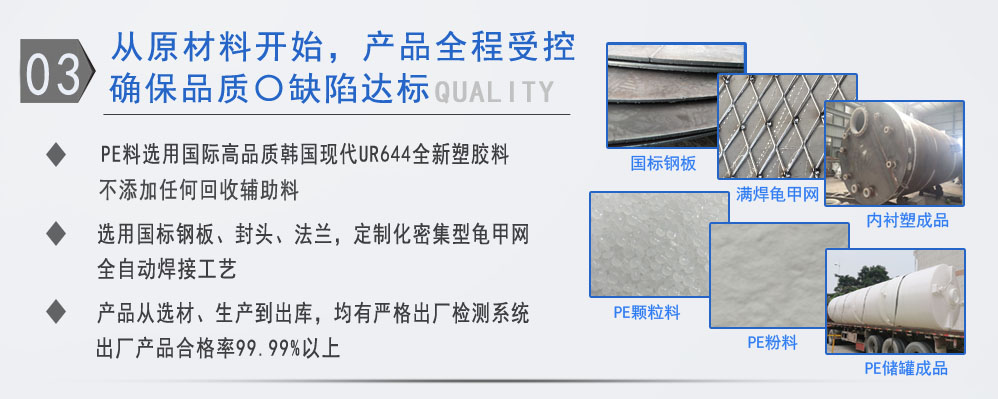 公司有鋼襯塑PE/PO、PE全塑、碳鋼、不銹鋼四大系列100多個品種,專注于常壓儲存容器生產,其產品包括鋼襯塑儲罐、管口一體成型PE儲罐碳鋼儲罐、不銹鋼儲罐、反應釜、攪拌罐、離子交換柱、鋼襯PE/PO儲罐塑料儲罐、鹽酸儲罐、硫酸儲罐等等。更大限度滿足廣大客戶的各種需求,同時可以根據客戶的需要加工定制各種防腐設備。